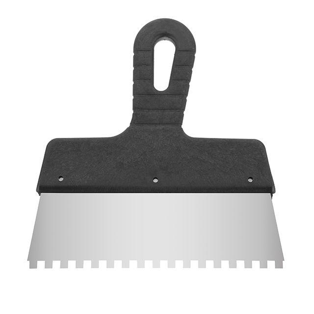Шпатель будівельний призначений для нанесення клейових та цементних розчинів на керамічну плитку, натуральний камінь при виконанні облицювальних робіт. Такий шпатель може використовуватися для внутрішніх та зовнішніх малярських робіт та оздоблення фасадів.